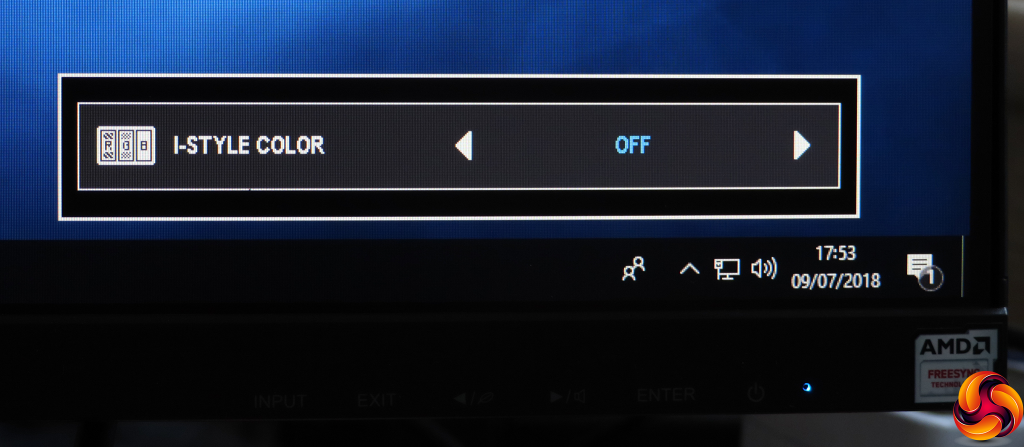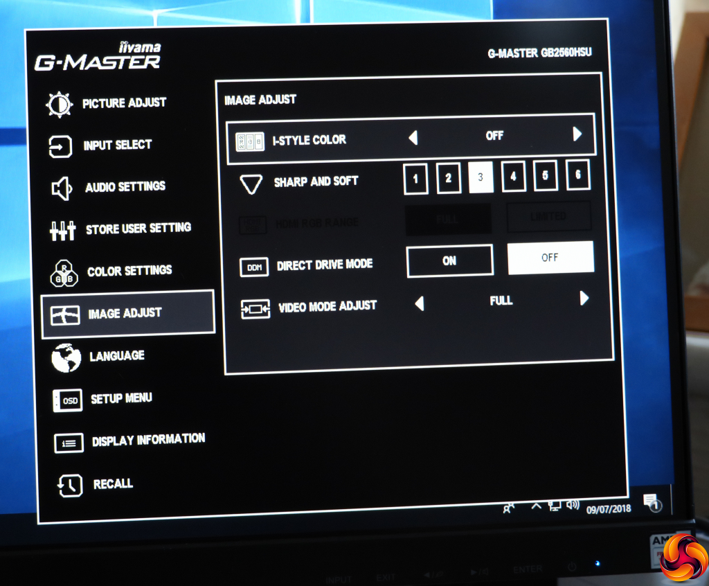 The Image Adjust section provides another route towards the I-Style Color presets, but also access to a sharpness control with six levels. You can turn on Direct Drive Mode, which reduces lag at the expense of quality, and Video Mode Adjust, which lets you switch to different screen sizes, including 17in, 19in, 19.5in, 21.5in, 23in, 23.6in, 24in, and Full. These enable the typical aspect ratio and screen diagonal for the size selected.