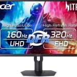 The key feature for gamers is Acer's DFR (Dynamic Frame Rate) technology. This allows the monitor to operate in two distinct modes: 4K at 160 Hz or 1080p at 320 Hz. This is paired with a rapid 1 ms GtG response time (0.5 ms MPRT) and AMD FreeSync Premium support for smooth, tear-free gaming.