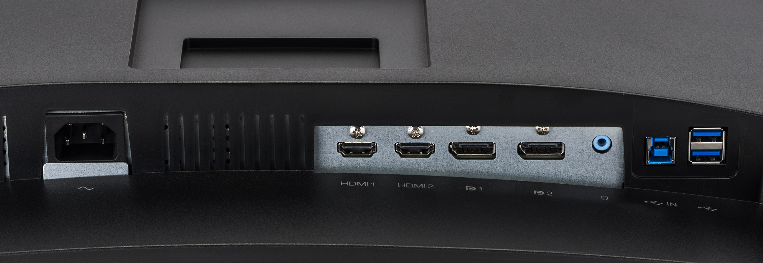 Available display connectors include 2x HDMI ports (3440×1440@100Hz), 2x DisplayPorts (3440×1440@144Hz), a 3.5mm headphone connector, and a USB hub with 2x USB 3.0 ports. You can adjust the monitor height by 110mm, and tilt (-5º to 20º) or use the 100×100 VESA mount to add a bracket to adjust it your way. There's also a pair of 3W speakers and a joystick controller to move in the monitor's OSD.