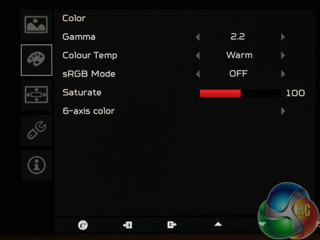 The Color menu lets you change the gamma between settings labelled 1.8 and 2.2, the colour temperature, and enable an sRGB mode, which brightened up the display considerably in use. There's a six-axis colour setting as well. You can save these to one of three presets.