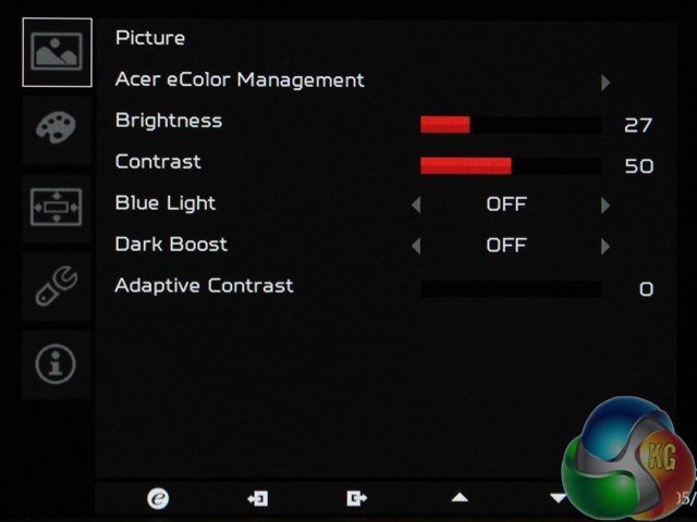 For the Predator range, Acer has redesigned its menu system with a sharp visual appearance, plenty of settings to adjust and a simple structure that makes it easy to find and adjust settings. Simple icons, quick response times and well chosen colours make it easy to see, with a red (what else?) primary colour for status bars and the like.