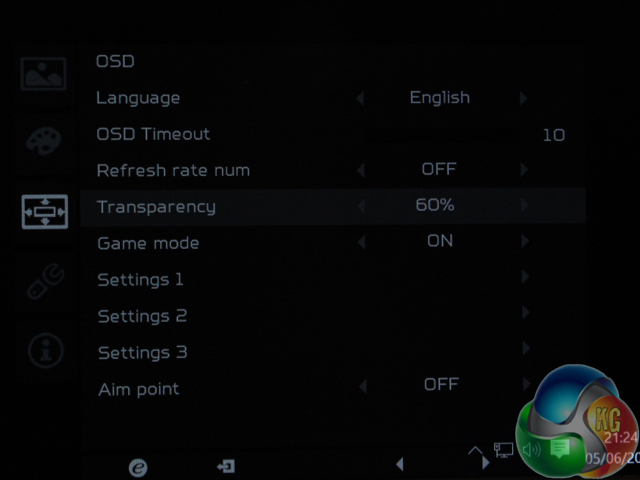 And the transparency setting adjusts the brightness of the OSD. Here it is at 60%, which is why the above image is barely legible.