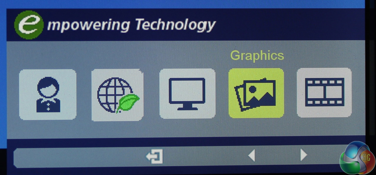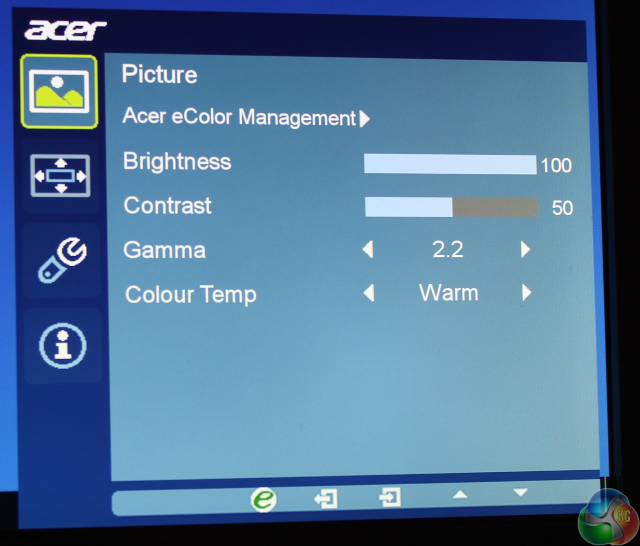 It’s controlled by any of the five buttons to the left of the power LED at the front of the XB280HK. Pressing any one of them brings up a main menu of five shortcuts. The function of each then naturally corresponds to the icon above it