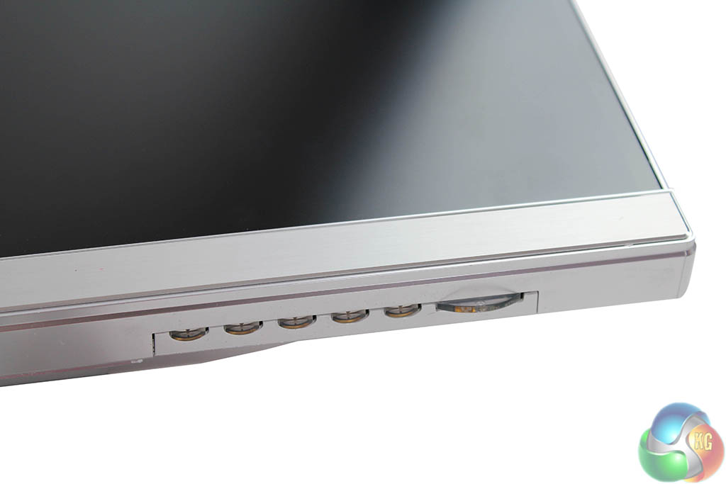 The inputs at the back are all located in a central, easily accessible position, indented in a metallic-coloured groove that again compliments the white chassis. There’s a DisplayPort connector, mini-DisplayPort connector, HDMI connector, DVI, headphone output, and an audio line-in connector. There’s a Kensington lock right at the bottom.