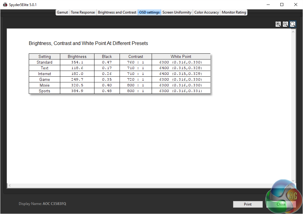 The brightness and contrast levels make up for it. While it’s not achieving the 2000:1 quoted contrast or the levels seen in other VA screens, 800:1 is still very impressive. And the maximum brightness of 390 cd/m2 when set to 100% is higher than most screens. The white point is slightly below the 6500K target.