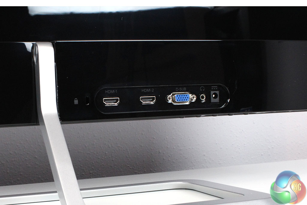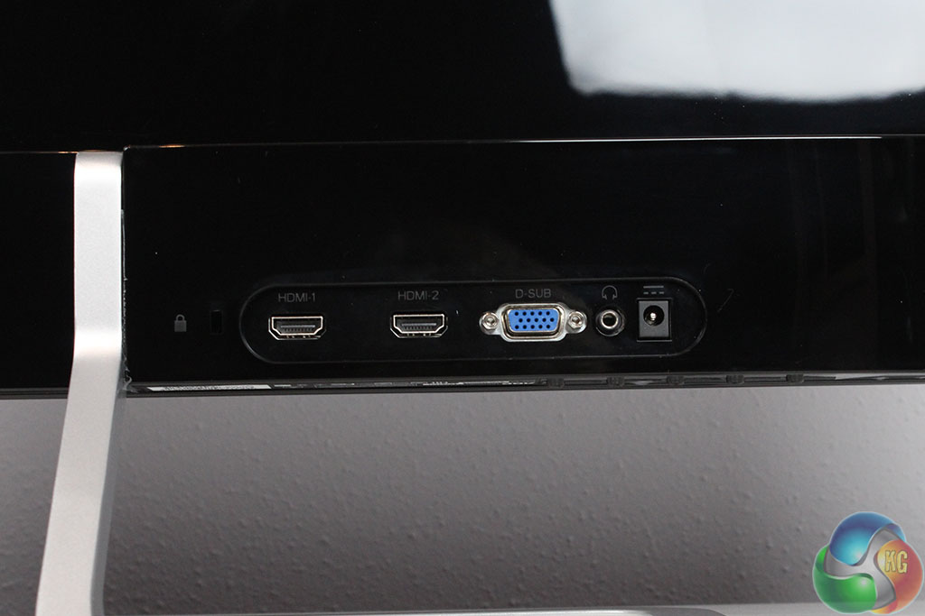 At the back you can see a pair of HDMI ports and a VGA input. There’s also the power connector, and a headphone output to the right, with a Kensington Lock connector to the far left.