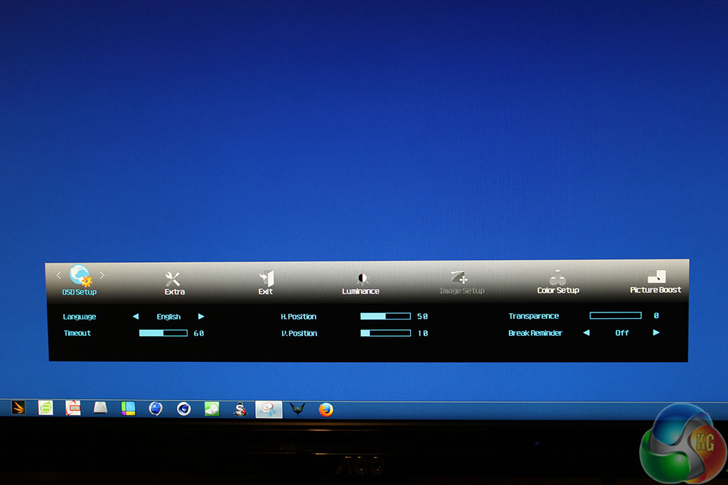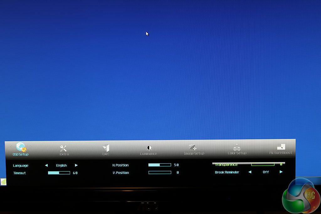 In the setup menu you can adjust the transparency, move the OSD from the bottom of the screen and change the timeout. There’s an amusing Break Reminder option that displays a warning on the screen every hour the display remains on, suggesting you go and stretch your legs.