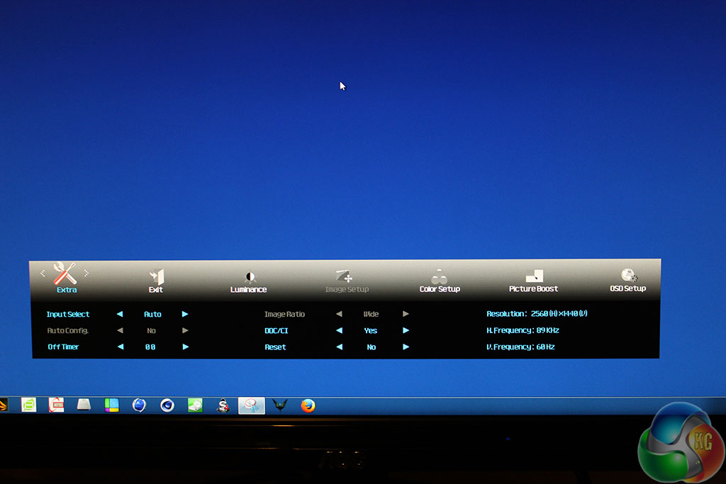 The Extra menu provides another way to select the video signal. AutoConfig resizes a display to fit. There’s support for DDC-CI (Display Data Channel Command Interface) for connection to external sensors. There’s also a reset button.