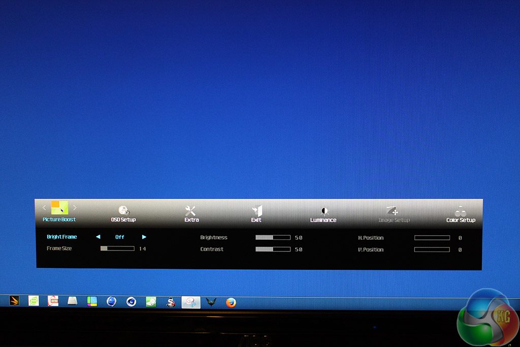 The button to the left of the power button brings up the OSD. By default, it appears right at the bottom, with a slight transparent effect that can make icons from the Windows desktop show through it. This can be changed in the OSD setup menu.