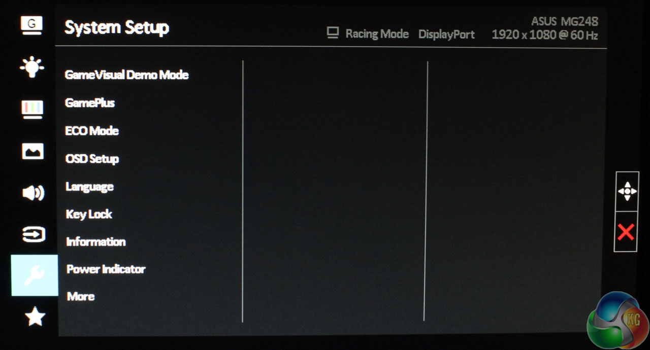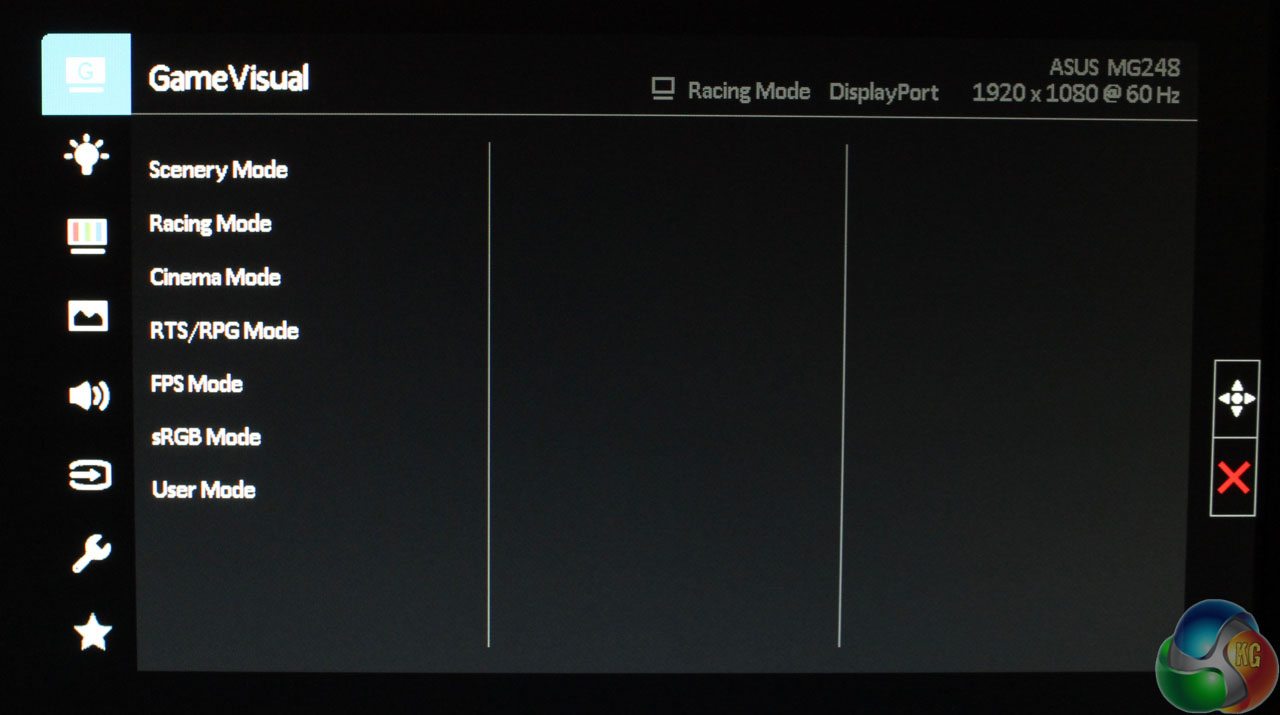 The main menu screen is a list of the GameVisual presets, a set of predetermined picture settings, with Racing Mode set to default, which is fairly standard on all Asus gaming displays. There are also settings for Cinema, Scenery, sRGB mode, FPS and RTS/RPG. We'll use a colorimeter to see exactly what each one looks like on the next page.