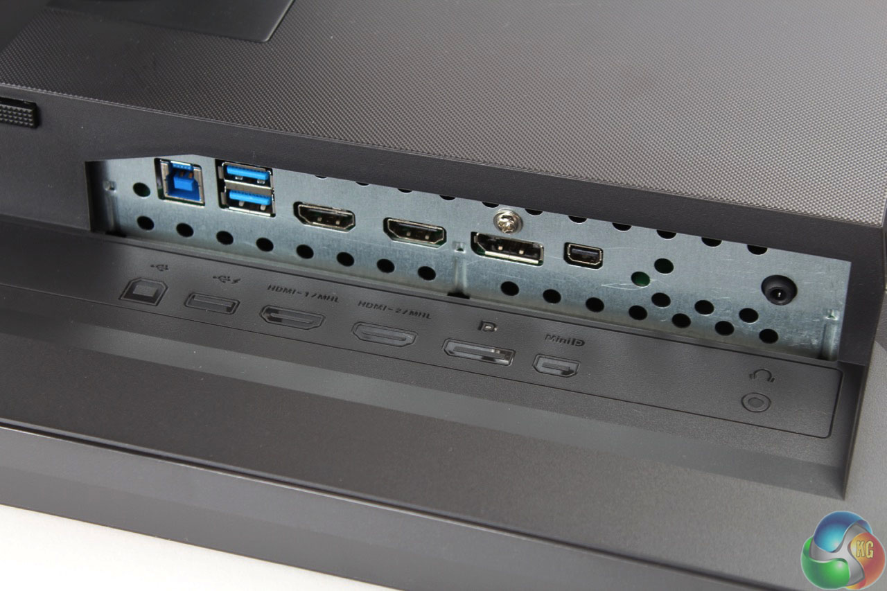 There’s a good range of digital video inputs located underneath. There are two HDMI 1.4 ports supporting MHL connections from Android devices, a full-sized DisplayPort 1.2 connector and a MiniDP connector. The MG279Q notably lacks support for HDMI 2.0.
