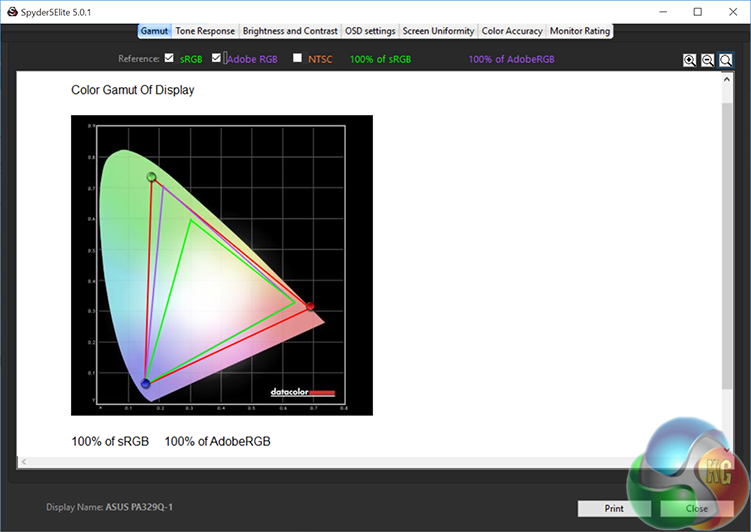 With our trusty DataColor Spyder 5, we measured the performance of the Asus ProArt PA329Q, first in its uncalibrated, out-of-the-box state, then again after calibration.