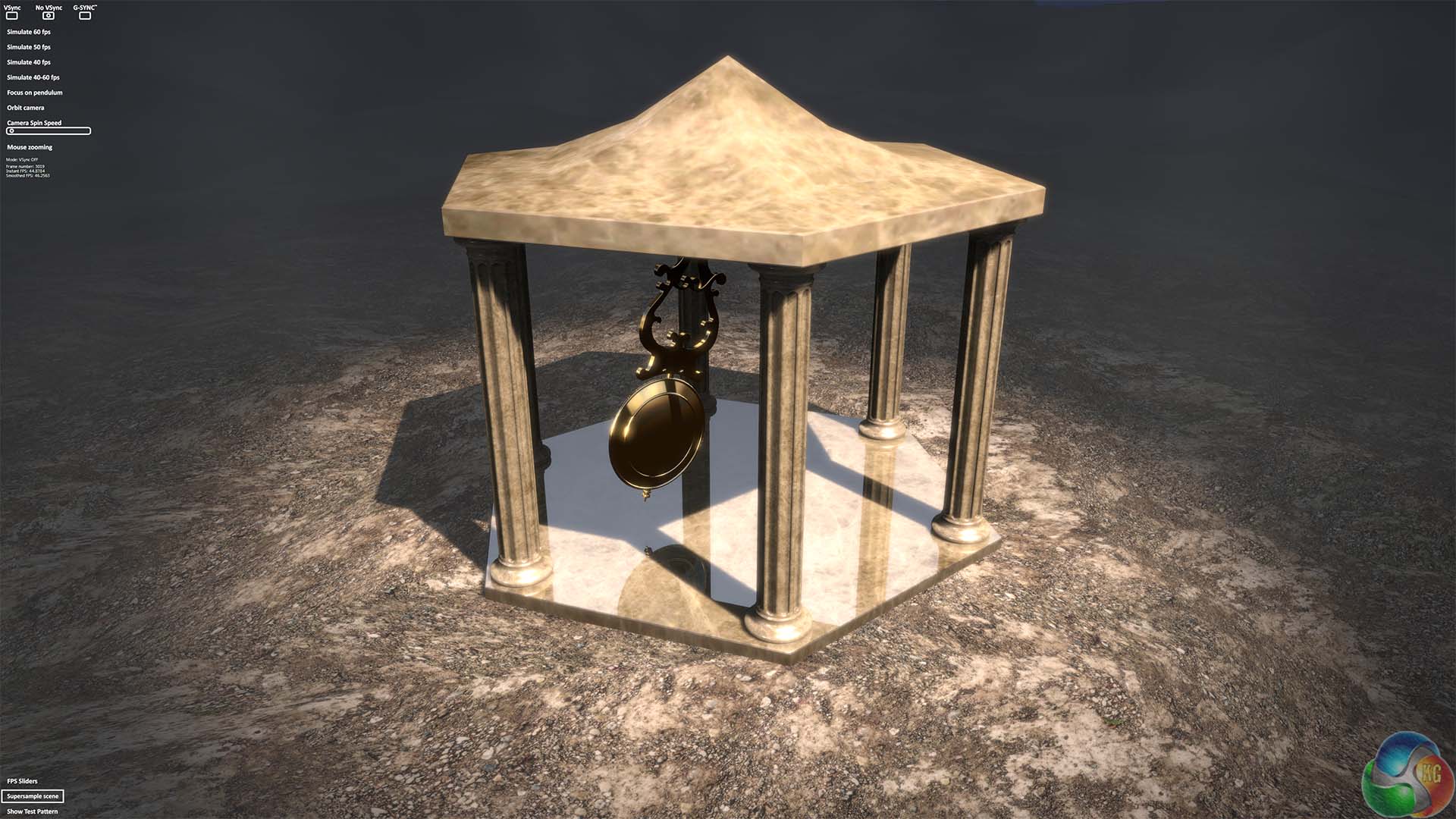 Of course, we also tested the PG27AQ with 3D applications and games to see how well its G-Sync feature worked. The first way is with Nvidia’s Pendulum demo, a scene with a pendulum swinging. With G-Sync disabled, its motion causes severe screen tearing, but this glitch goes away when G-Sync is turned on. And with the PG27AQ this effect was very noticeable and worked well.