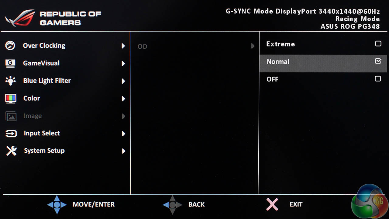 The image menu has a single setting for the overdrive function with three options labelled Off, Normal and Extreme.