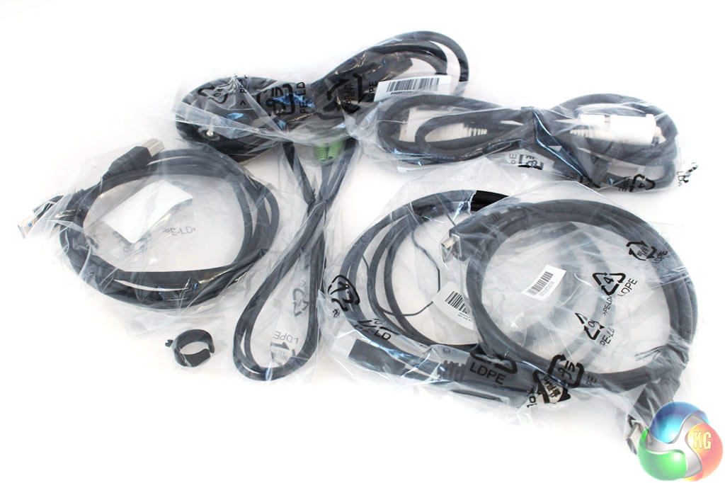 Inside is the usual selection of cabling, including a DVI cable, DisplayPort and mini DisplayPort, HDMI, and a USB 3 uplink cable.