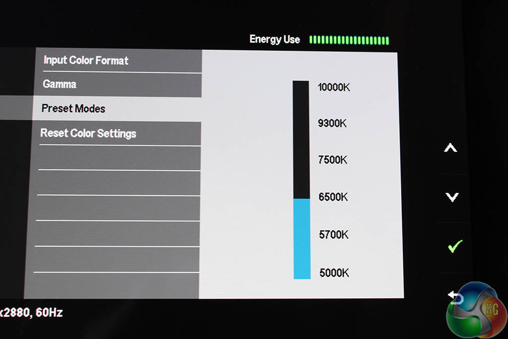 If you press the select button on ‘Color Temp’ you get a list of six white points ranging from 5000K to 10000K, with the default set at 6500K. We think this really should have been given its own menu option.