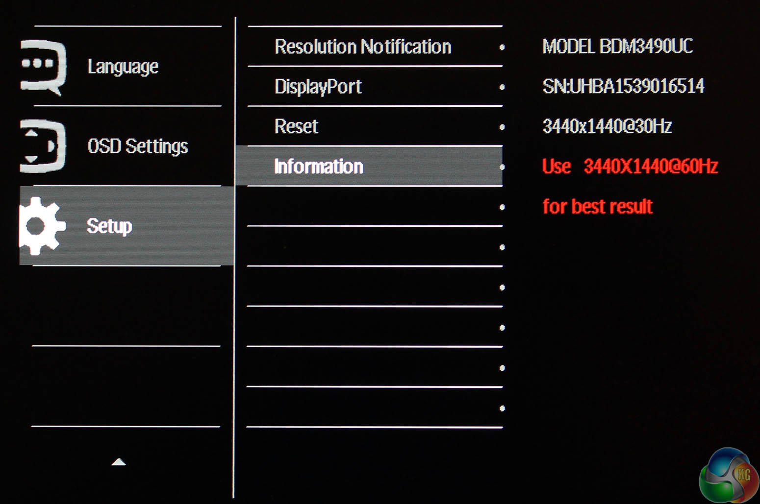 The final menu screen called Setup lets you reset the Philips Brilliance BDM3490UC to factory settings, view information and switch DisplayPort from version 1.1 to 1.2. By default it is set to 1.1, meaning a 30Hz refresh rate and choppy mouse movement.