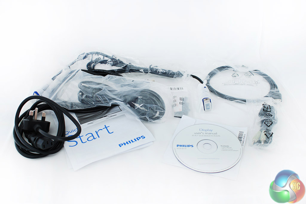 Inside the box is a quick-start guide, a CD with the manual and bundled Philips software including a calibrator, a DisplayPort cable, VGA cable, MHL HDMI cable, USB uplink cable, audio cable and a set of screws for the stand. According to the manual, the supplied video cables vary depending on the region the Philips BDM4065 is being sold in.