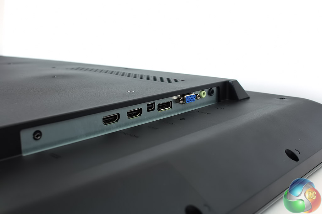 The video inputs are on the left-hand side. There’s a VGA port, mini DisplayPort, DisplayPort and two HDMI ports plus a pair of audio connectors. There’s also an RS232 connector right at the bottom.