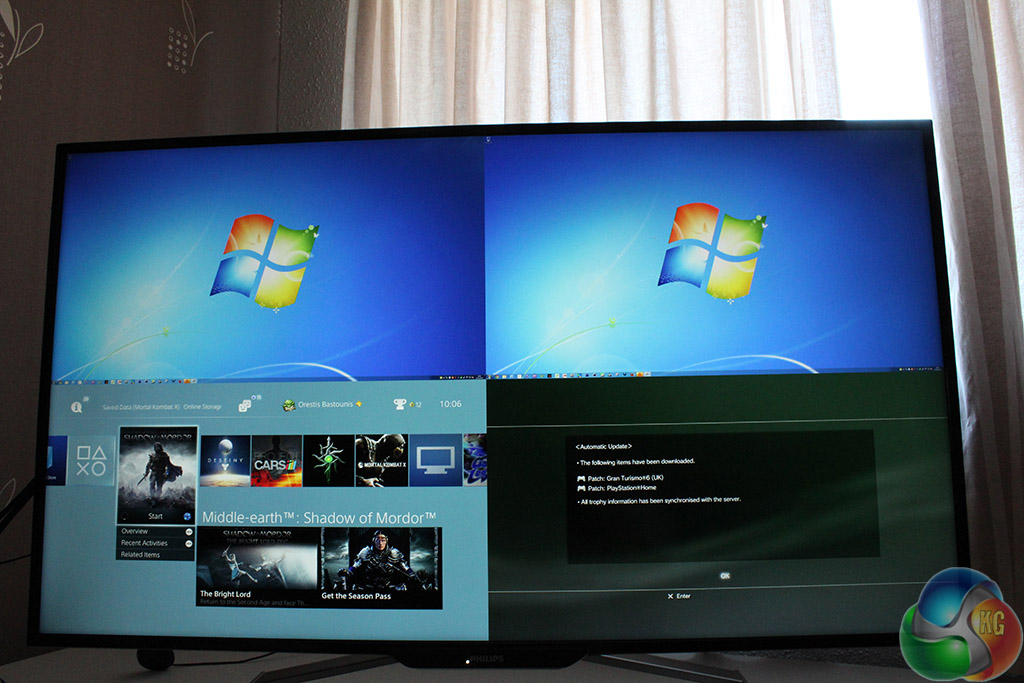 In this image, in the top left the BDM4065 is acting a secondary display for a Mac, with a PC’s main display output in the top right. In the bottom left is a PS3, and in the bottom right, a PS4.