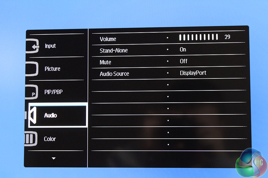 In the Audio menu, there’s a volume control for the two 7-watt integrated speakers, options to change the default audio input, and a mute option. This isn’t the best place to adjust the volume, since its buried in a submenu of a menu, requiring three clicks of the joystick to get to, which is why we prefer the joystick downward press to adjust the volume.
