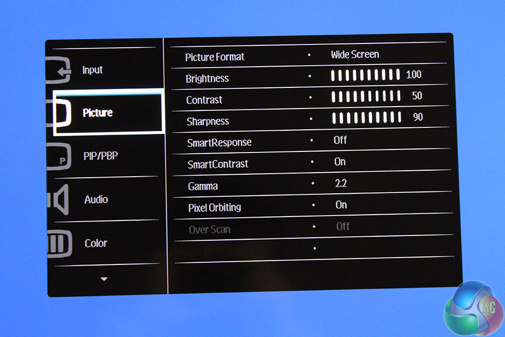 Pushing left brings up a menu of seven video presets in the SmartImage section. These aren’t just different colour settings. The backlight, response times and contrast levels are adjusted to suit the activity, amongst other adjustments.