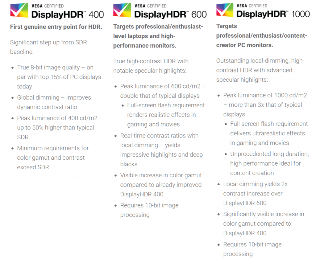 The most recognisable monitor HDR standards are set by the VESA body, which has three different classifications: DisplayHDR400, DisplayHDR 600, and DisplayHDR 1000. While the latter two at least attempt to incorporate the essential elements by demanding low black levels, increased luminance and DCI-P3 colour coverage over the sRGB colour space used by SDR, DisplayHDR 400 only demands 400 nits of brightness, a contrast ratio of 955:1, and a colour space of 95% of BT.709 (equivalent to sRGB). Yes, subtract around 50-100 nits of brightness and that’s pretty much the exact spec of every good high-end SDR monitor from the past few years. Just to be clear, it in no way matches any of the HDR requirements, and watching HDR content on a DisplayHDR 400-certified monitor is not going to show you what all the (justified) fuss is about.