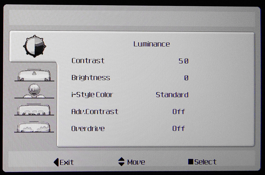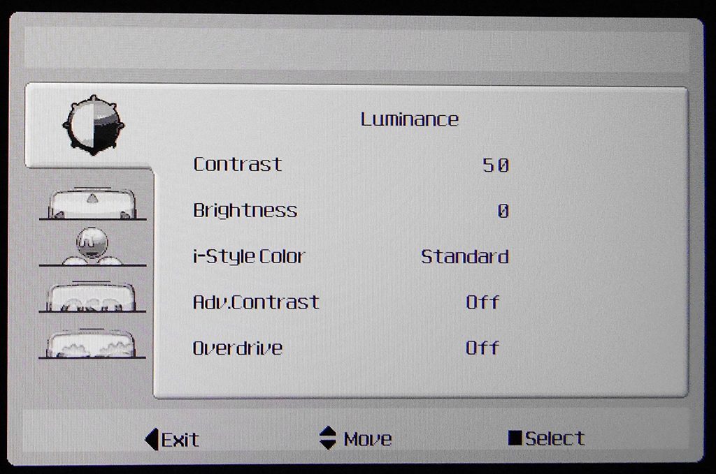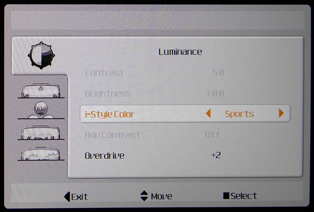 Choices of where to place certain options seem quite bizarre. For example, the first menu on the main list is named Luminance, but in addition to the Contrast and Brightness settings one might expect, it also contains the Overdrive setting and something called “i-Style Color”. Ludicrous naming aside, i-Style Color is kind of like a preset that controls most of the other menus in the whole OSD, and greys out quite a few of them in most of its presets. Given its importance it seems odd to make it the third entry down, and it might have been the perfect candidate for the joystick’s ‘up’ shortcut.