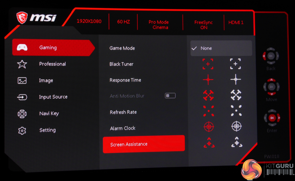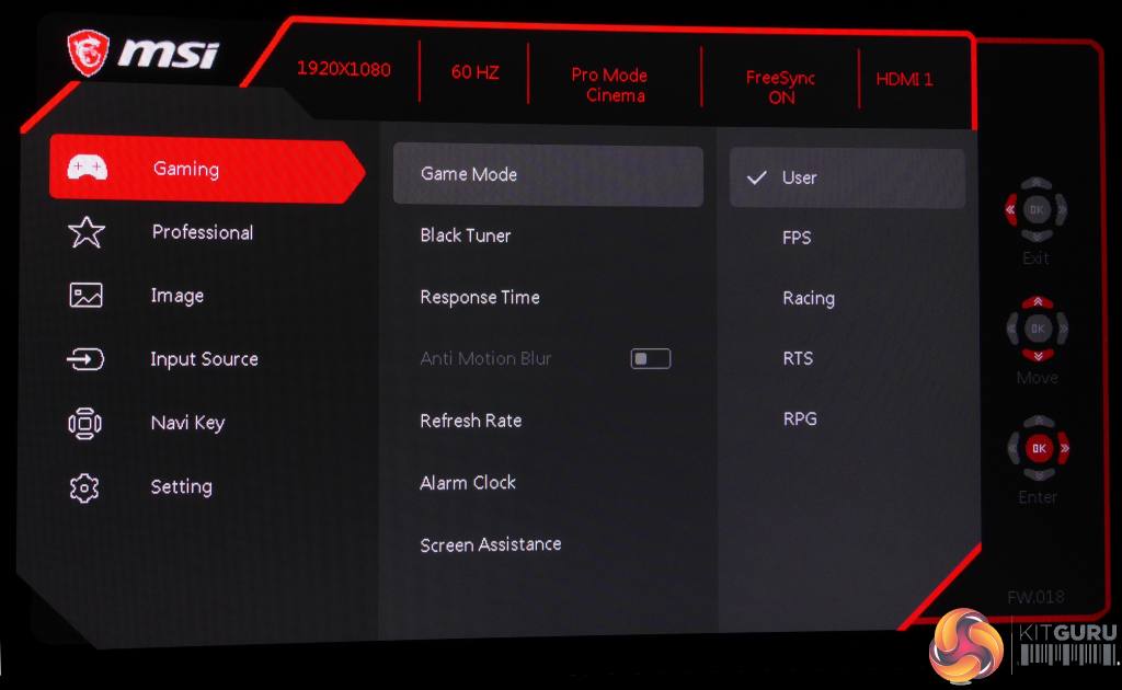 Next up under Gaming is Response Time, which you can set to its default Normal, Fast or Fastest. We generally find the latter overdrives the pixels on a VA panel a little too much resulting in trailing, but here it’s a different kettle of fish as the Fastest setting is inextricably linked to the next menu option: Anti Motion Blur. Setting response time to Fastest will automatically activate this option, and vice versa.