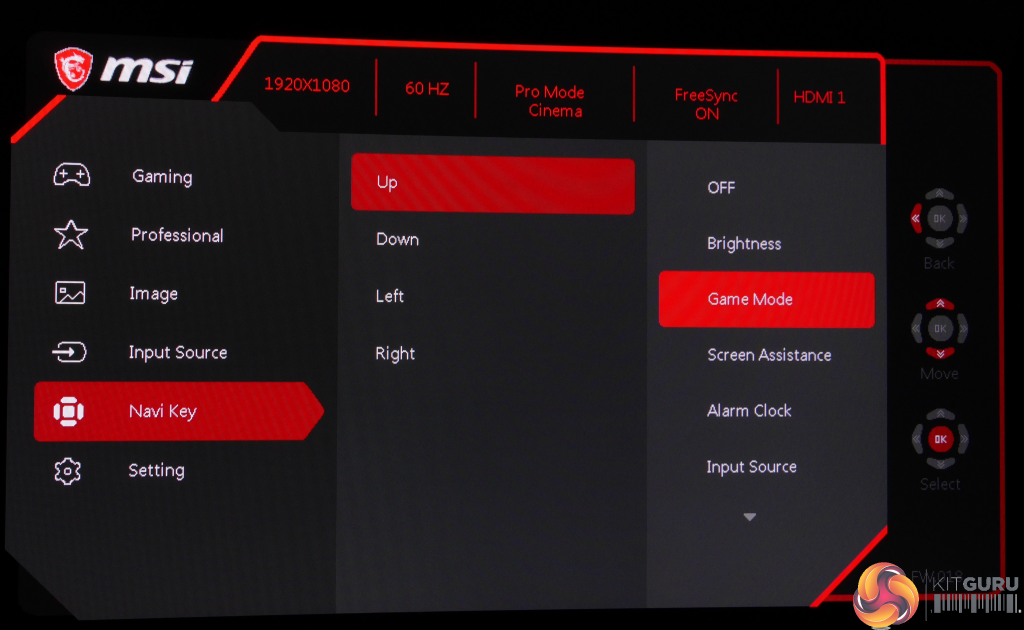 This brings us to the input selection menu, the Navi Key menu for programming those joystick direction shortcuts, and the Setting menu, which lets you adjust things like OSD timeout, switch audio between analogue or digital, and toggle the RGB LED lighting on or off (this works for both the front and rear lights, so you can’t have one without the other).