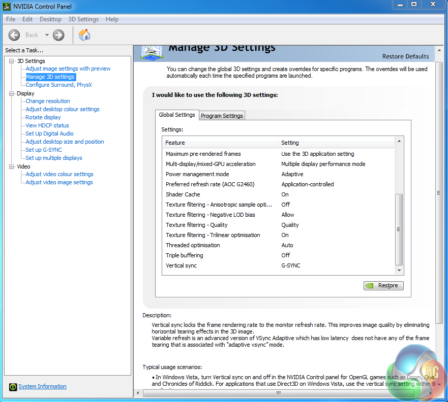 After the drivers were installed we went to set up G-SYNC. It was already enabled. We went into Manage 3D Settings and checked in the Vertical Sync options that G-SYNC was enabled.