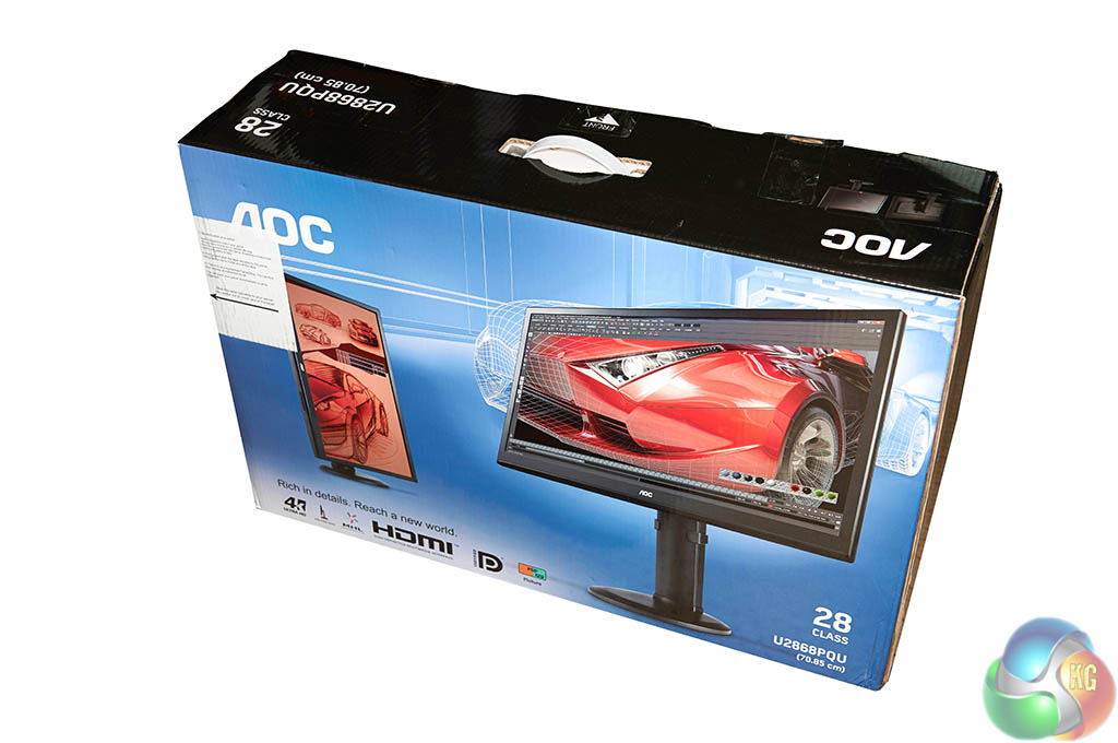 The AOC U2868PQU arrives in a full colour box, highlighting the monitor display and some specifications. The box weighs almost 11kg.