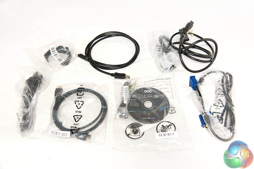 The bundle is extensive. AOC include an HDMI cable, DisplayPort cable, VGA cable, audio cables, software disc, cable clip and USB cable. Our review sample also shipped with a European and UK power cable.