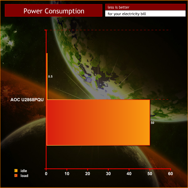 When idle, the AOC U2868PQU uses 0.5 watts. After our calibration, it demanded 50 watts at the socket.