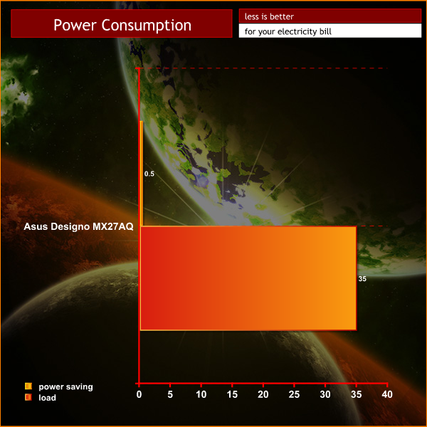 The monitor consumes 35 watts after a little calibration, and this drops to 0.5 watts when in power saving mode.