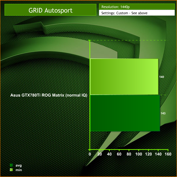 At the High image quality preset, the frame rate dropped in the more intensive sections of the benchmark to around 110 frames per second, with an average of 133 frames per second. Reducing the image quality to the Normal quality preset helped to hold the frame rate very close to a constant 144 frames per second. Next game to test was the latest version of GRID – entitled GRID Autosport. This was released a couple of weeks ago.