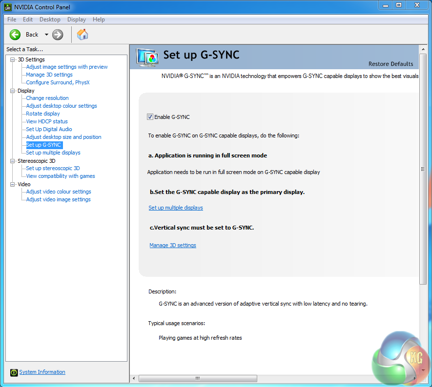 After the initial install, we loaded the driver to check the ‘Set up G-SYNC' panel. It was already enabled. We went into the Manage 3D Settings and checked in the Vertical Sync options that G-SYNC was selected.