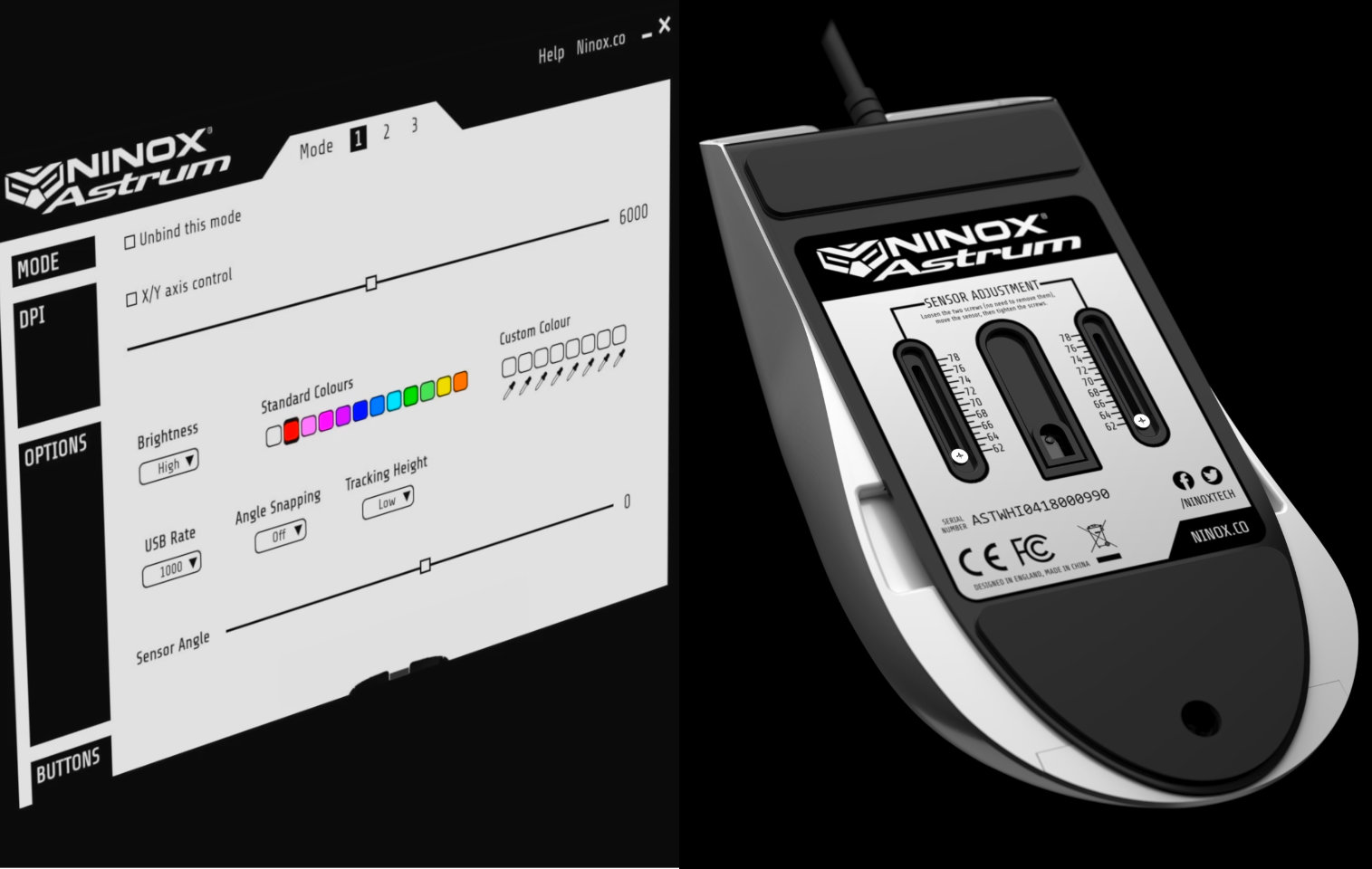 Packing a Pixart PMW-3360 Sensor, capable of 12,000 DPI and 6.5 meters per second tracking speed, the Astrum isn’t skimping on the internals. The sensor can even be adjusted in height by loosening two screws on the underside of the mouse. DPI can be switched effortlessly without the use of software, however the utility does offer more customisability in the form of setting default DPI profiles, key binds and macros.