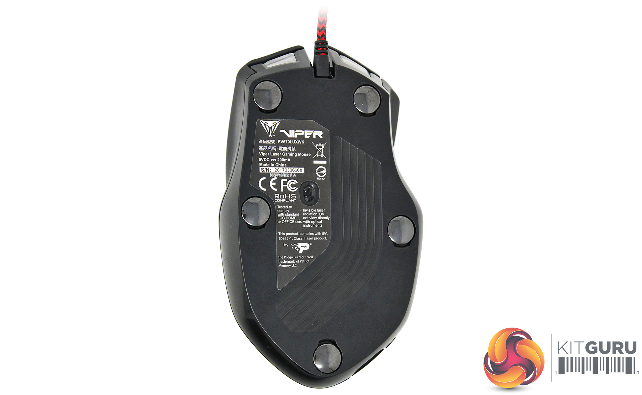 Flipping the mouse over, the design is slightly plain, showcasing the product information and its Avago ADNS 9800 laser sensor. One of the most unique aspects of this mouse is the five ceramic foot pads, a feature that has only been seen on a handful of mice in the past.