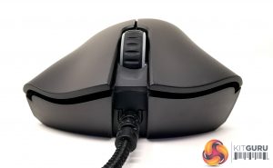 The scroll wheel houses two LED strips either side of the indented rubber grip, acting as a fifth button when pressed. The lighting is synced with the LEDs beneath the snakehead logo on the mouse’s rear, each shining Razer’s emerald green.