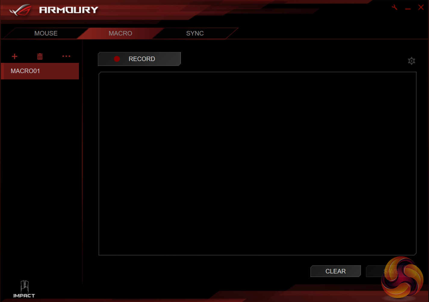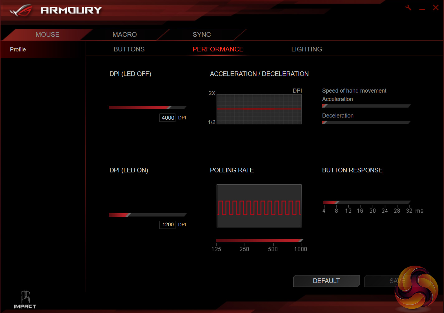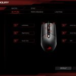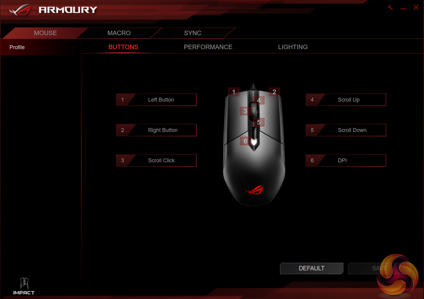There are 5 tabs available to the Impact while using the Armoury software: buttons, performance, lighting, macros and sync.