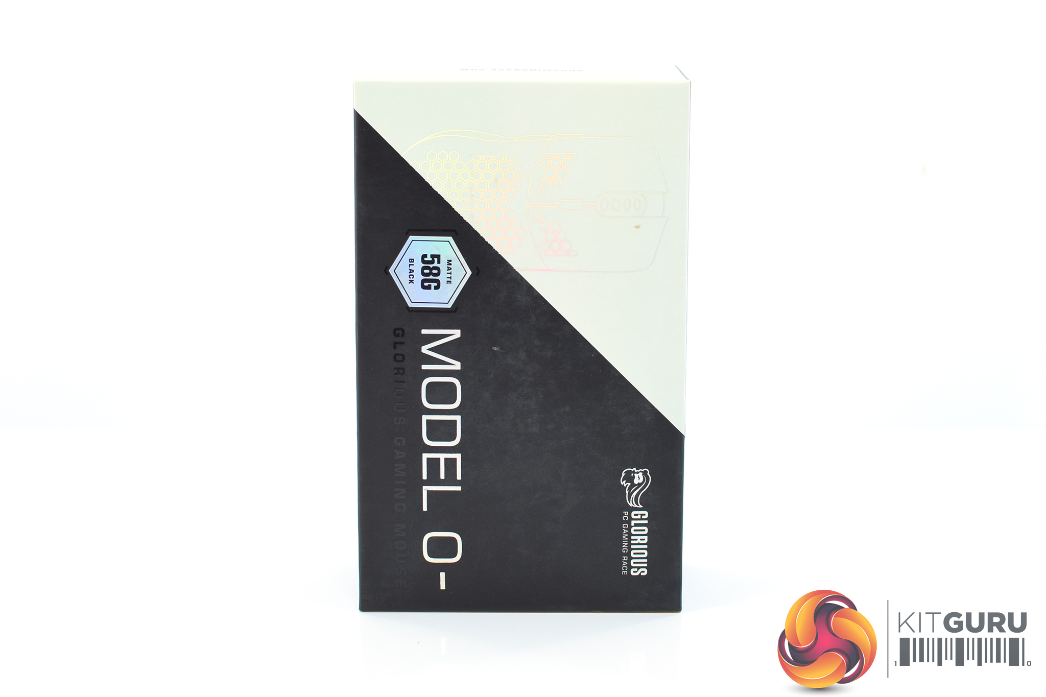 The Glorious Model O- ships in a clean-looking two-tone box, with product branding and the 58g weight advertised on the front.