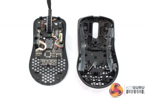 Taking the mouse apart, we can see just how little there is to the shell itself – even the PCB is only as big as it absolutely has to be to keep the weight to a minimum.