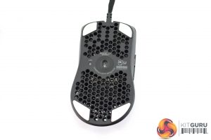 Flipping the mouse over, we can see even more holes surrounding the PMW 3360 sensor in the middle. There are four 100% PTFE mouse feet in each corner of the Model O-, and while no spares are included in the box, these are available to purchase separately if you want spares and they fit both the Model O and Model O-.
