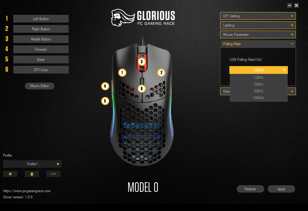 Additionally, there are options for polling rate – 125Hz up to 1000Hz – as well as a debounce delay option for the primary buttons. On the left hand side of the page there are options to remap the mouse's buttons, and you can also record macros from within the software.