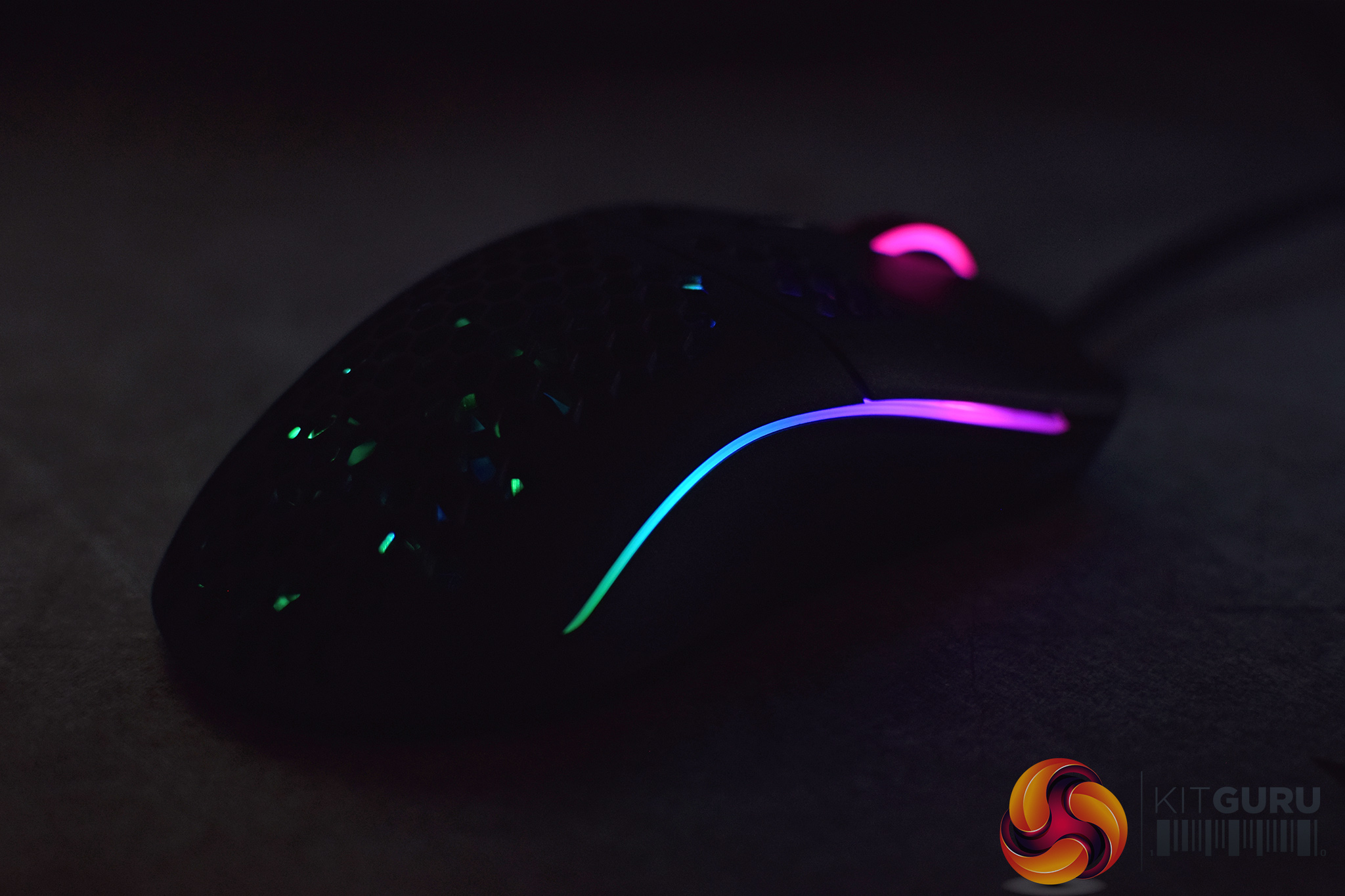 Lighting for the Model O comes from three zones – one LED strip on either side of the mouse, and then the scroll wheel. I do think it looks good, particularly when the lighting bleeds through the honeycomb holes on the top of the shell – it's an appealing aesthetic. On top of that, the LEDs are fairly bright and the colours look good, so I can't really complain here. You can of course turn the RGB off if you want to – some might even go as far as removing the LED diffusers to reduce the weight by a couple of grams – but for most people the RGB lighting will be plenty sufficient.