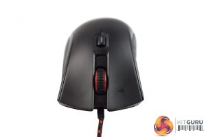 At the top of the mouse we find the scroll wheel and a single DPI cycle button. Incidentally, the scroll wheel is one of two zones which light up.