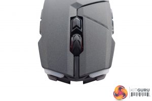 At the front of the mouse we find the scroll wheel as well as a single DPI cycle button just below it.