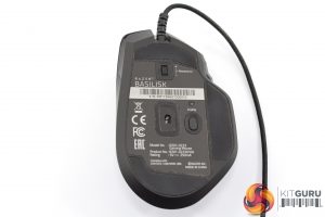 On the underside of the mouse, there are a couple of things to note. First of all, right at the top, there is actually a small scroll wheel resistance dial which lets you tune the scroll wheel's resistance to your liking. Next to the sensor, there is another small button labelled ‘profile'. This lets you change between 4 different profiles which can be stored to the mouse's internal memory, removing the need for software.