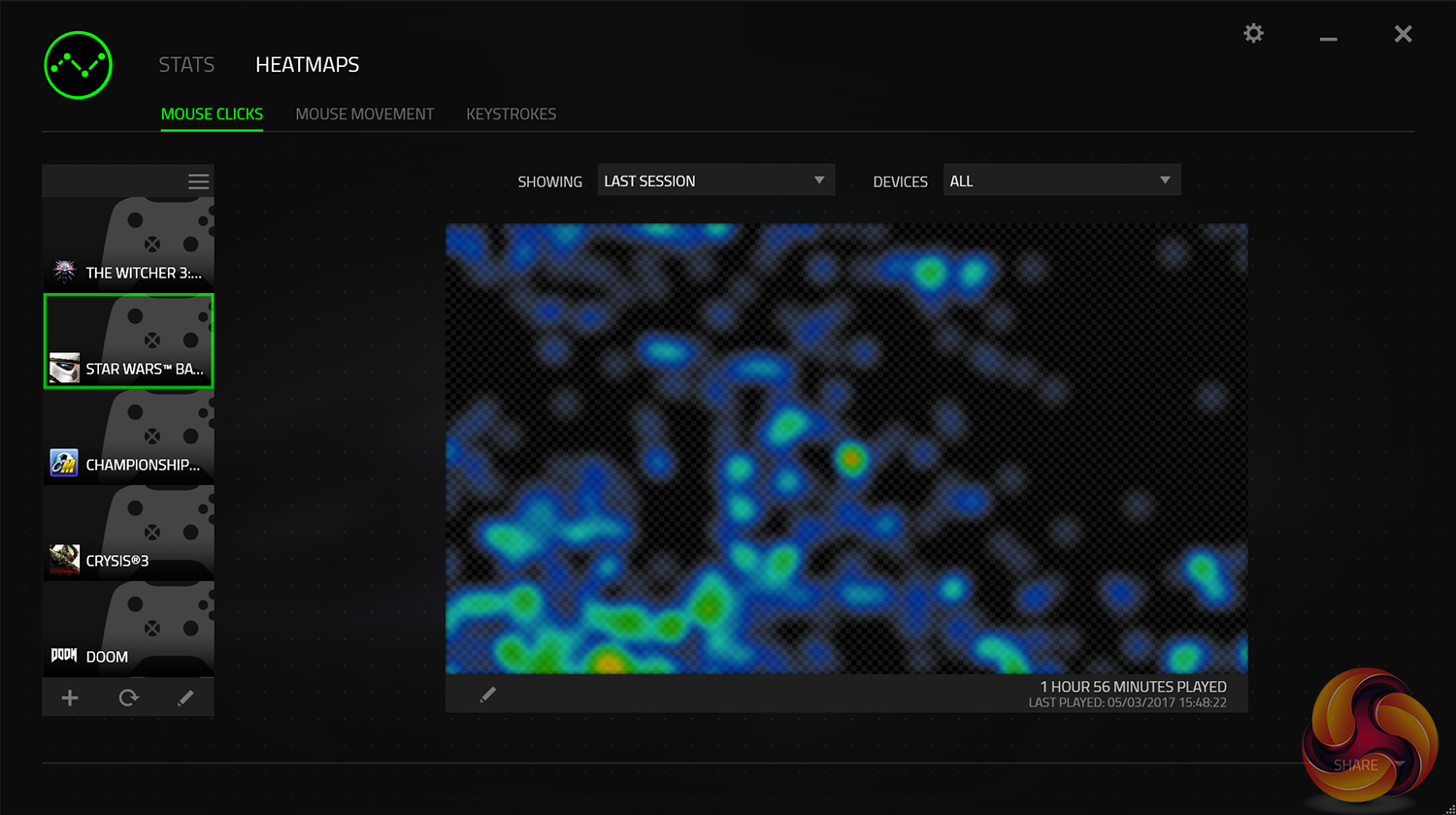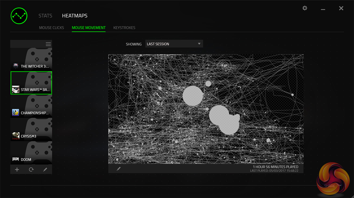 Then, there is also the cool ‘stats' section. Here, the software tracks how many clicks you make each gaming session, while it can also create a heatmap of your clicking, as well as a schematic map of your movements.